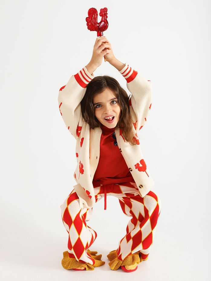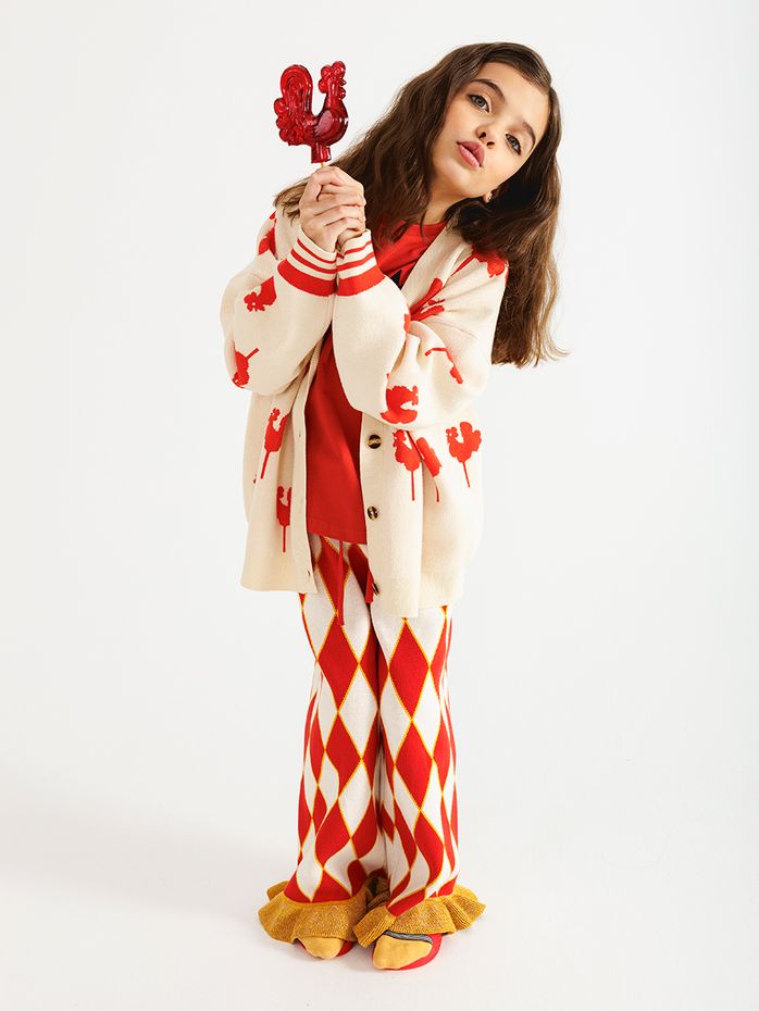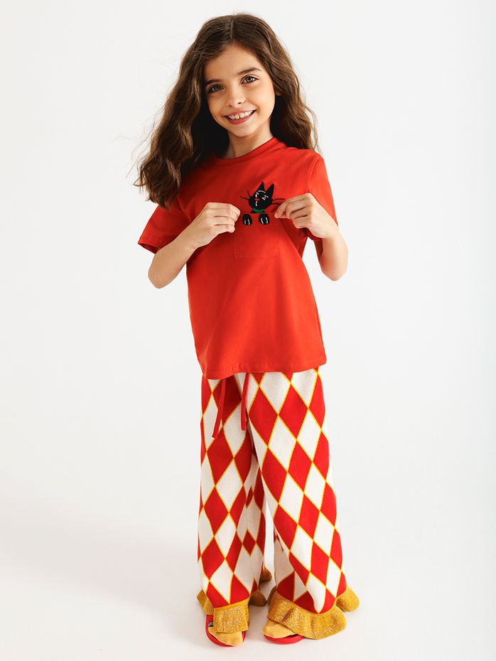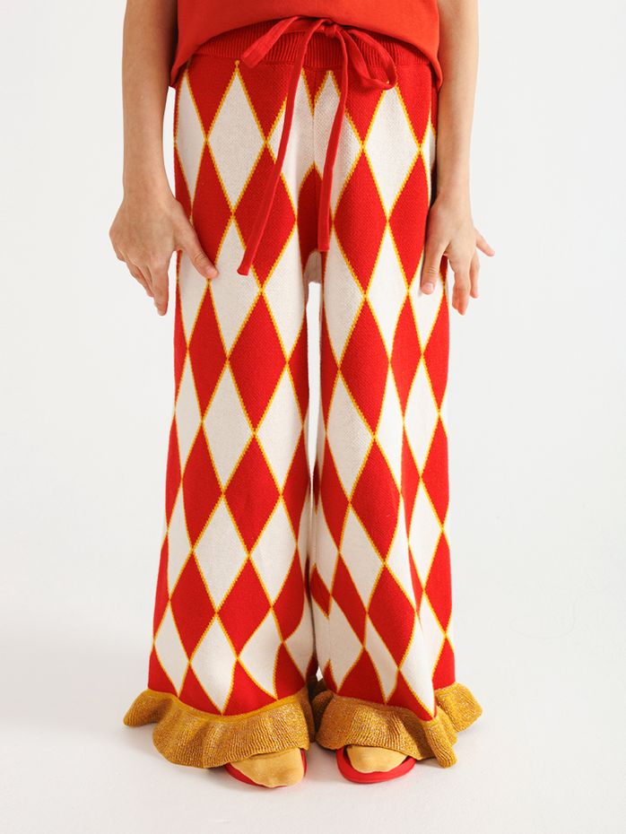 Вязаные брюки средней плотности красного цвета с принтом "ромбики" и бахромой по низу штанины. Бахрома с добавлением золотого люрекса, придающий штанам праздничный вид.