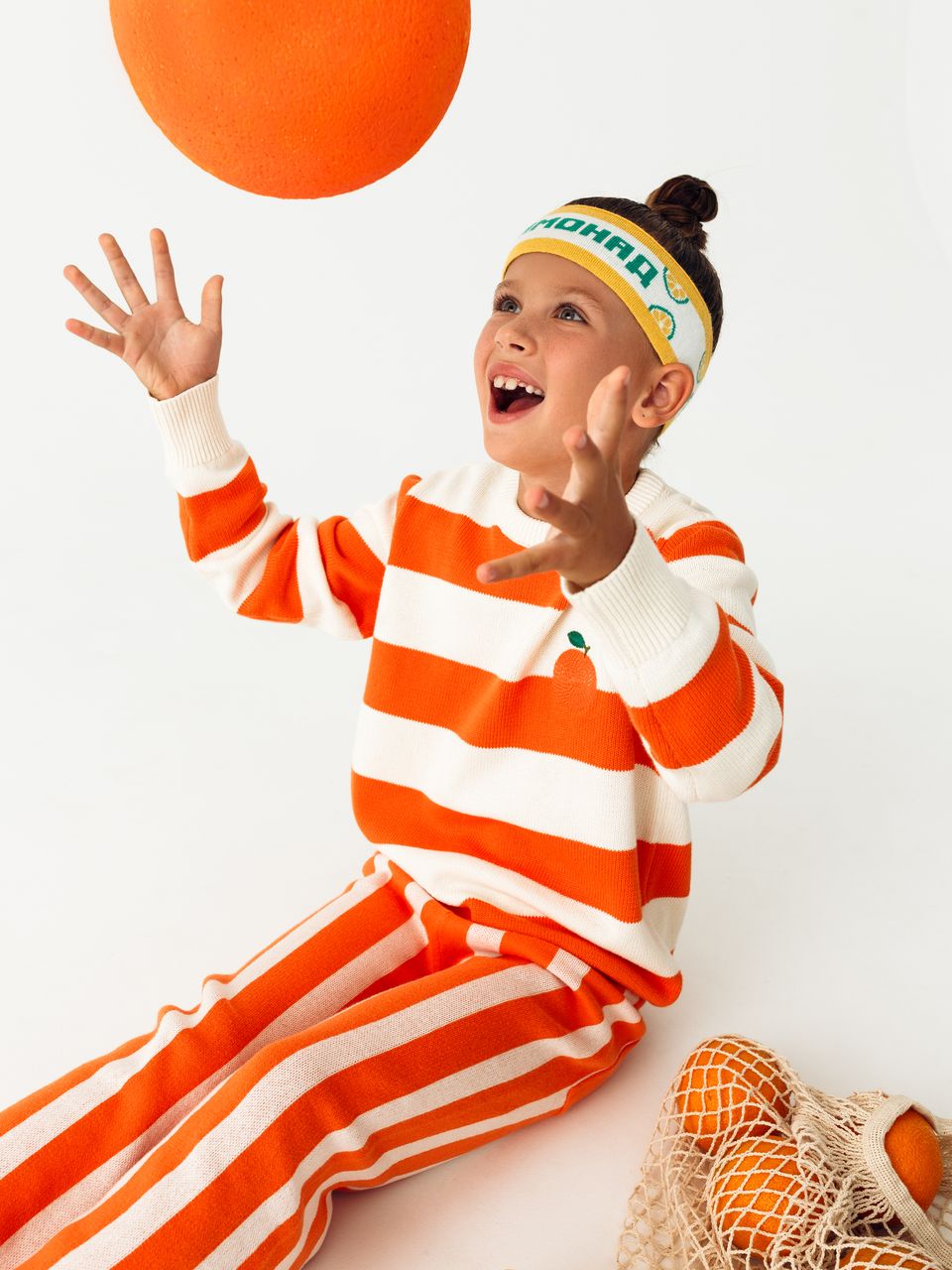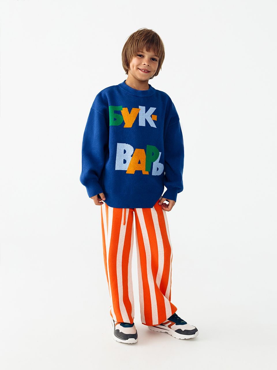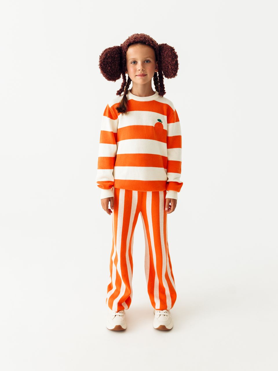 Широкие полосатые вязаные брюки средней плотности. Выполнены из 100% хлопка. Без застежки, со шнурком. Два кармана сзади.