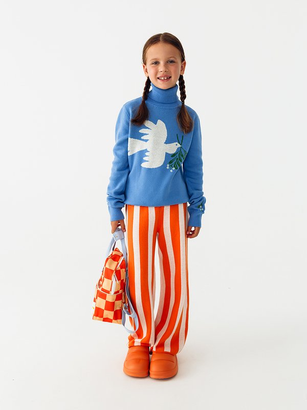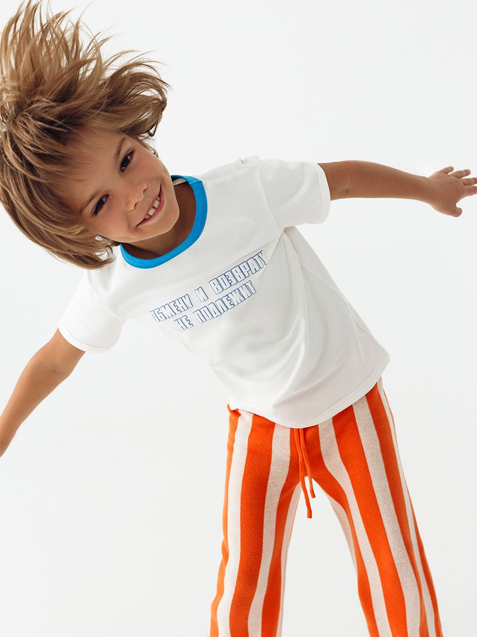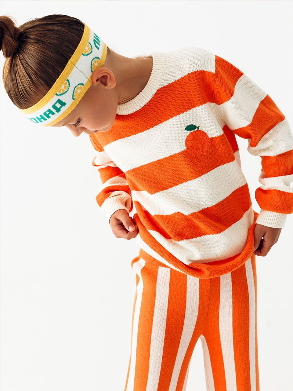 Широкие полосатые вязаные брюки средней плотности. Выполнены из 100% хлопка. Без застежки, со шнурком. Два кармана сзади.