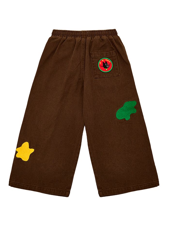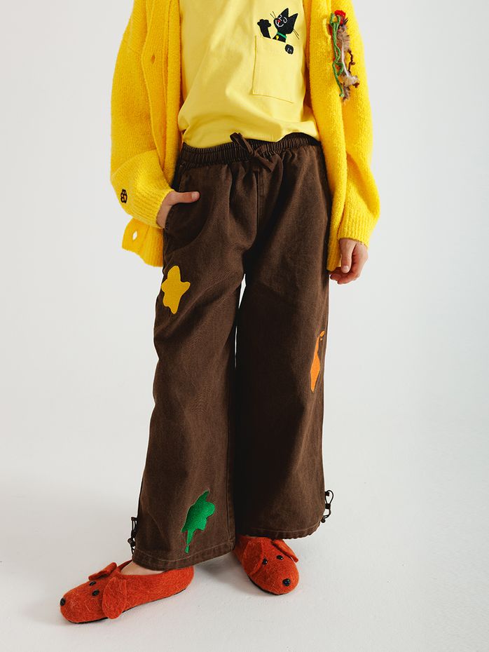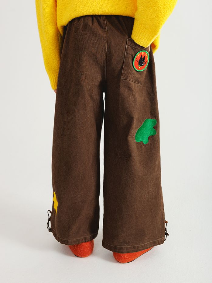 Детские штаны коричневого цвета порадуют вас наличием прикольных нашивок, удобных карманов и практичной резинки с фиксатором внизу штанины.