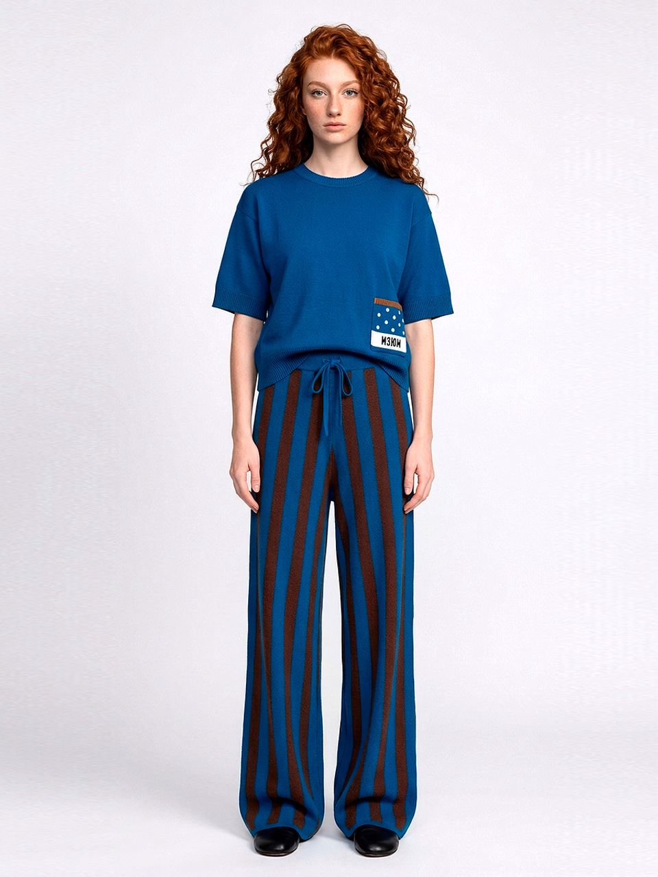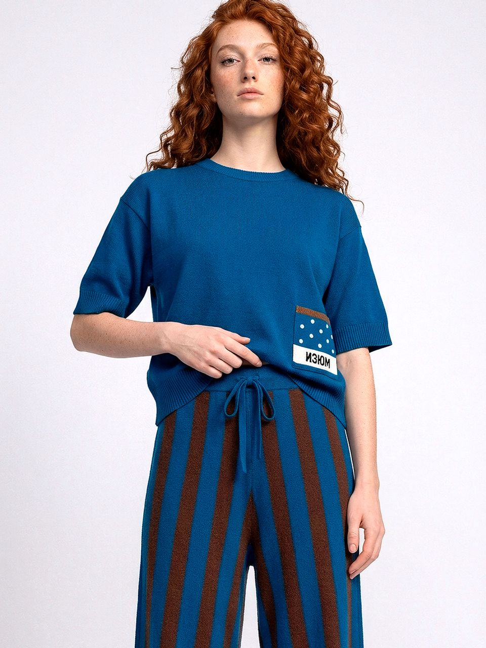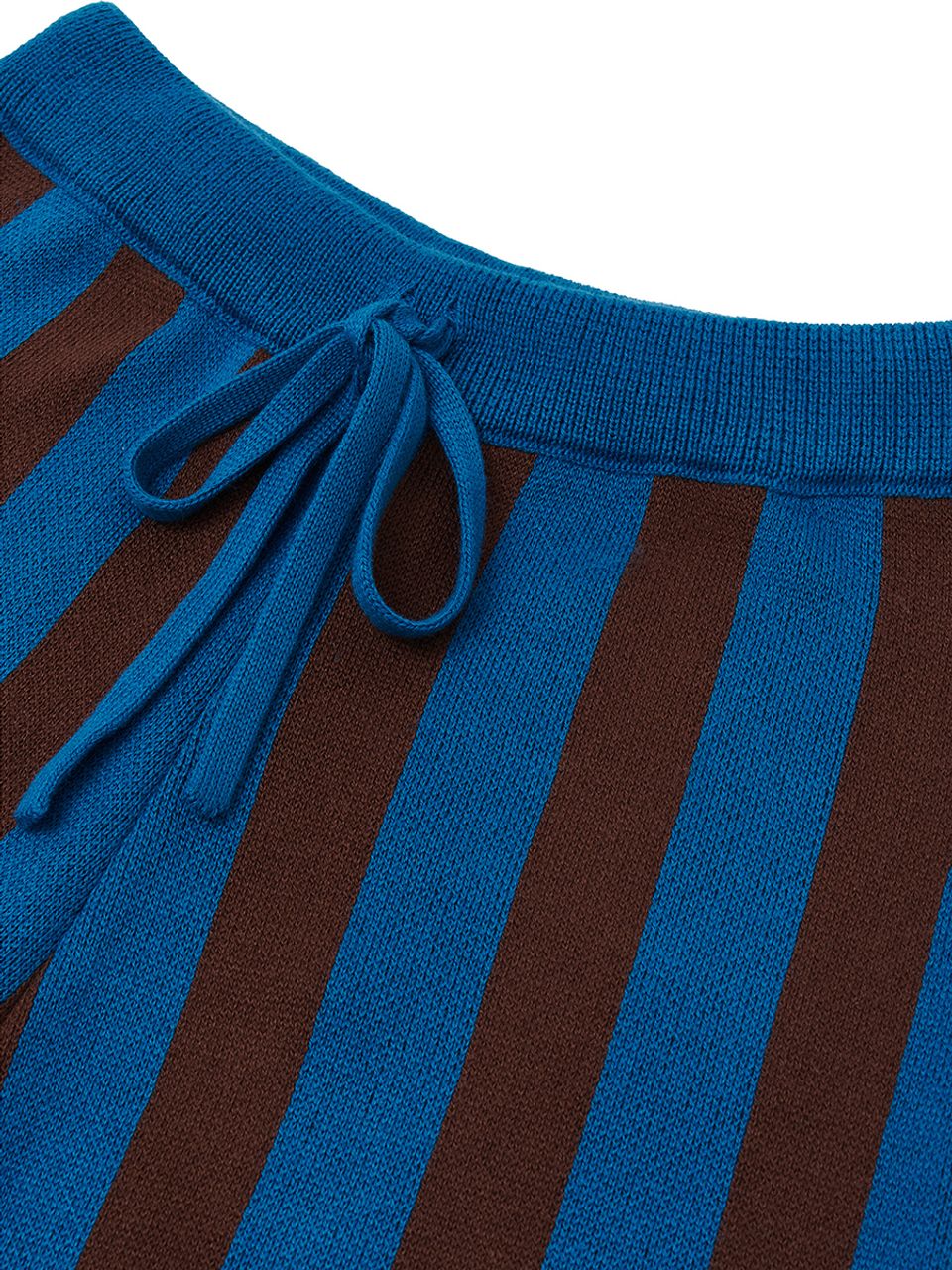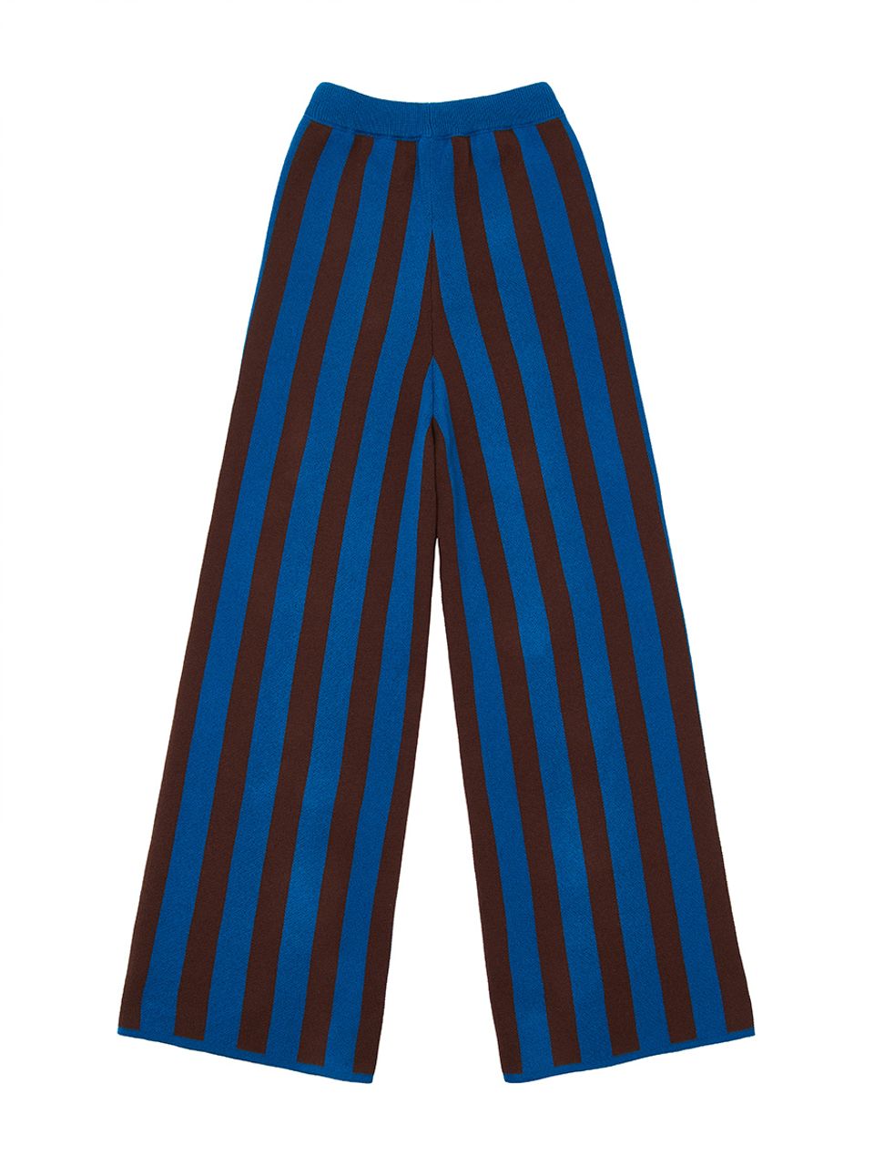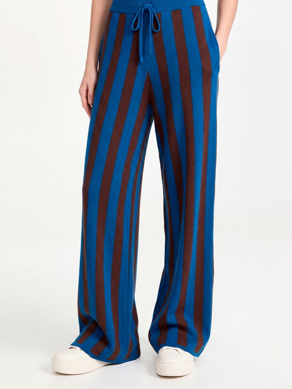 Яркие штаны в сине‑коричневую полоску с ретро‑ноткой, мягкие на ощупь и удобные в носке.