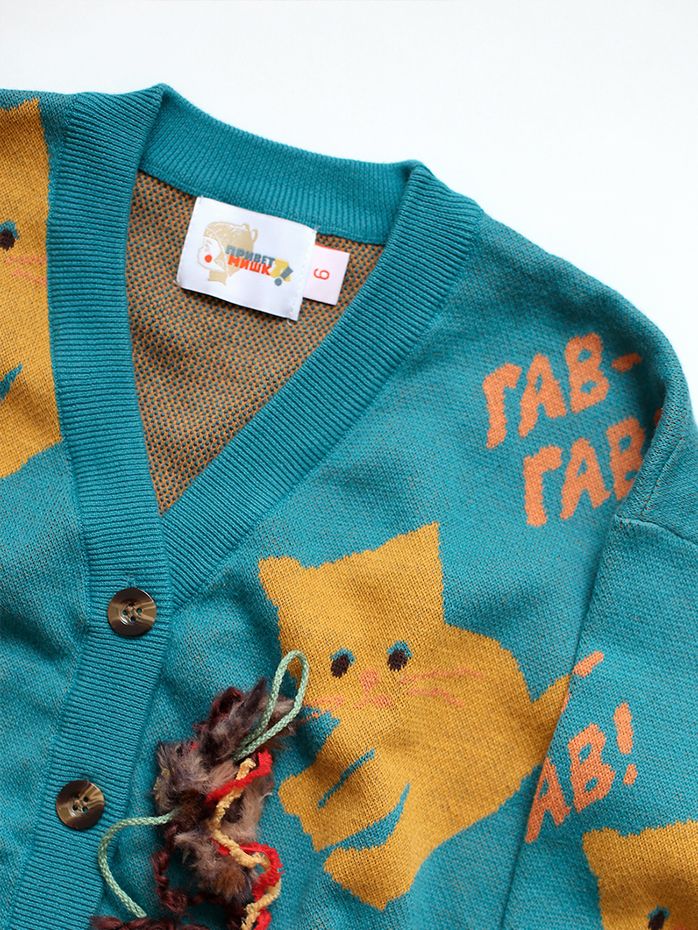 Кардиган оверсайз бирюзового цвета с котиками отлично подойдет для походов в гости и светских выходов. Кардиган с котами легко сочетать с джинсами, а также любыми другими базовыми вещами без активных принтов.