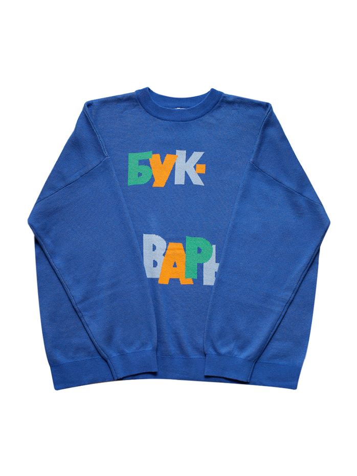 Женский и мужской джемпер темно-синего цвета выполнен в ностальгическом стиле с орнаментом в виде букв, сложенных в слово "Букварь". Свитер трикотажный, средней плотности, изготовлен из 100% хлопка.