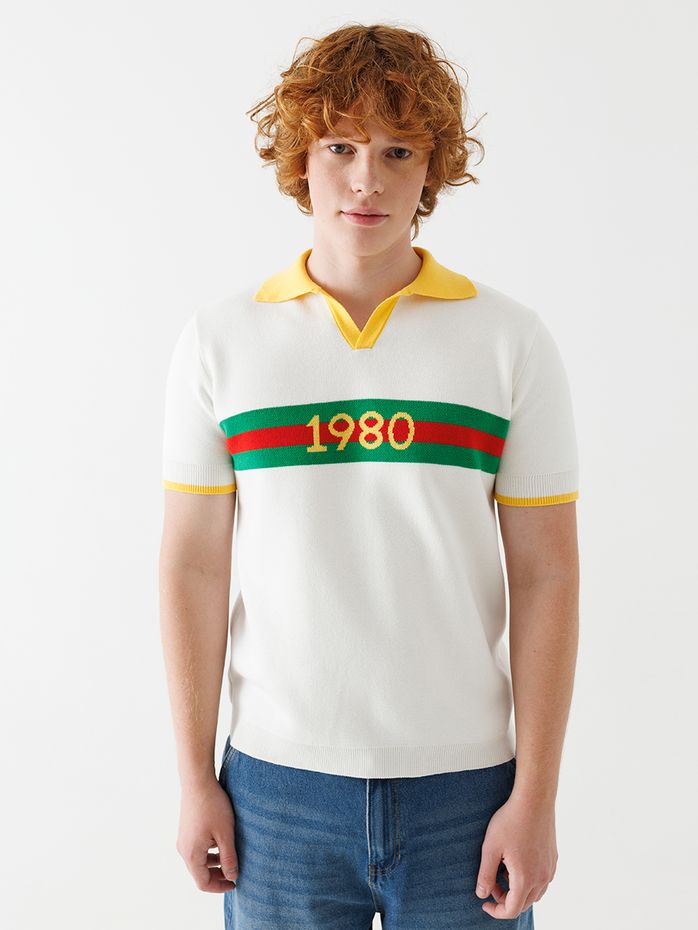 Мужской вязаный джемпер-поло в стиле спорт-шик, вдохновленный Олимпиадой 1980 г в СССР. Выполнен из умягченного хлопка в жаккардовой технике. Свободная посадка, хорошо сидит.