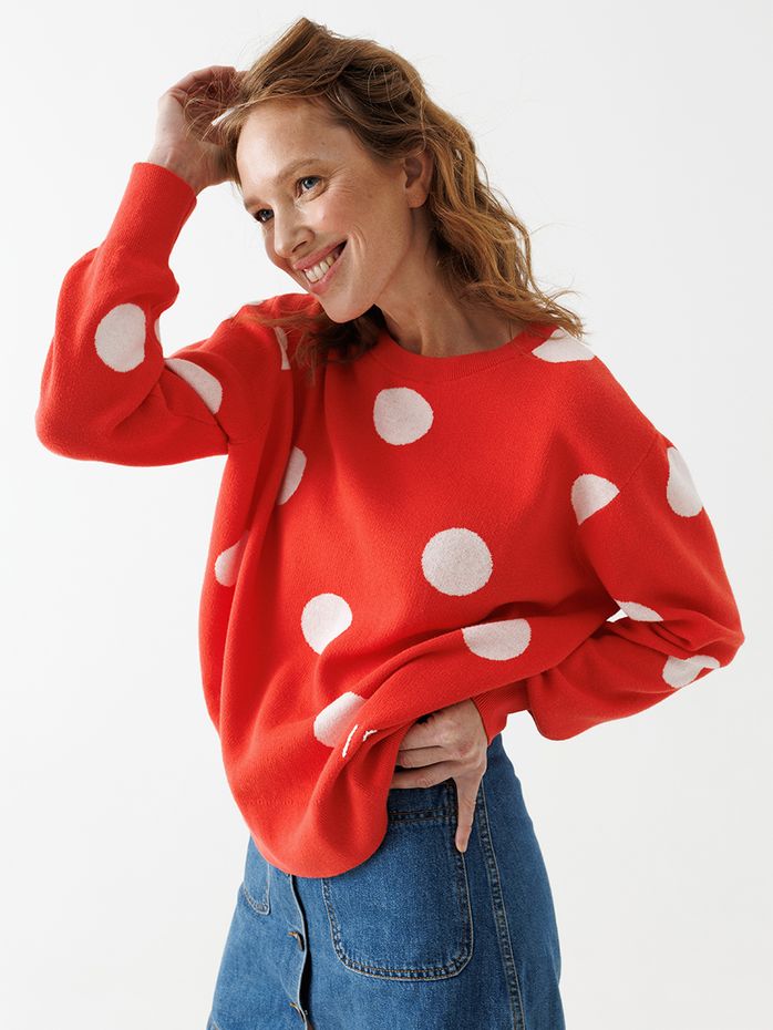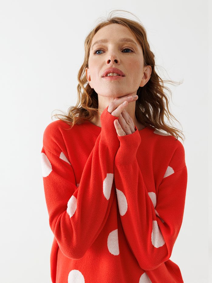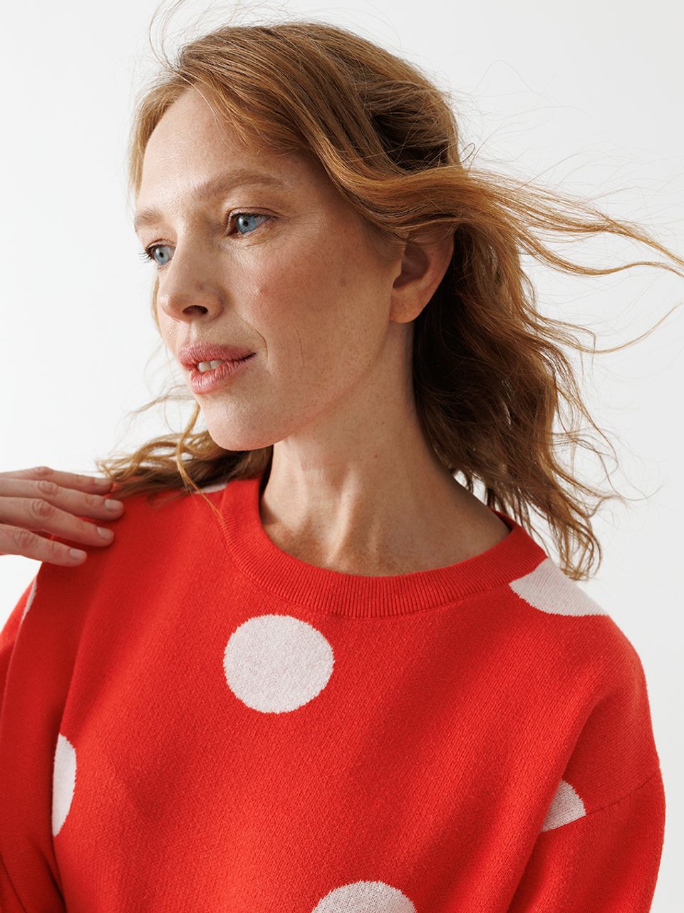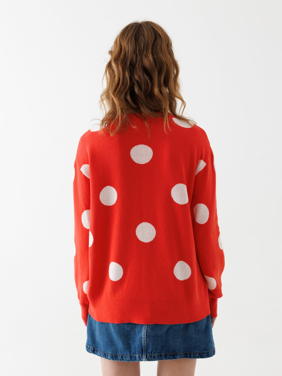 Вязаный джемпер красного цвета в горох от бренда Привет Мишка - это стильное и комфортное решение для тех, кто ценит индивидуальность. Модель выполнена из мягкого хлопка с гладкой фактурой, что обеспечивает приятные тактильные ощущения.