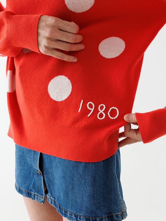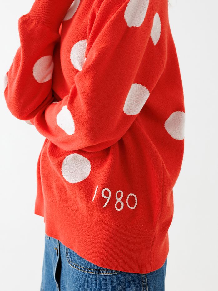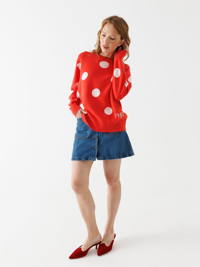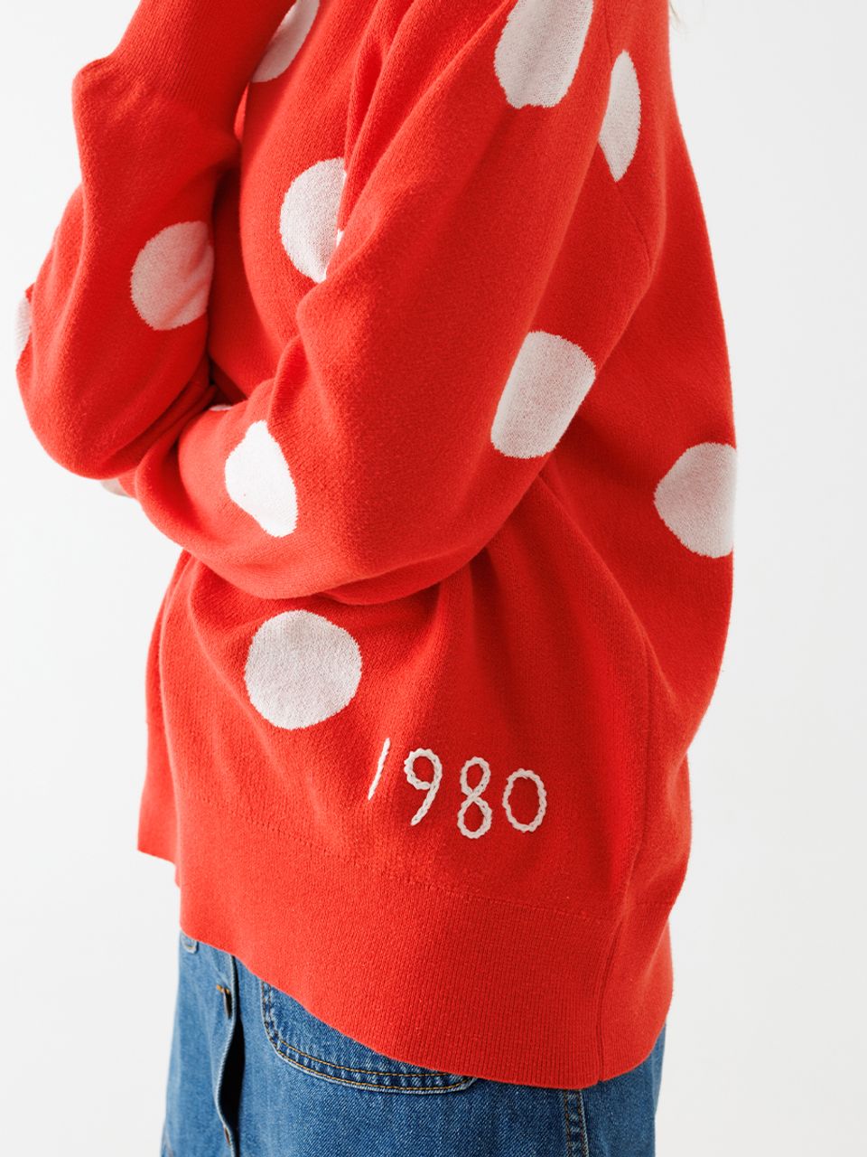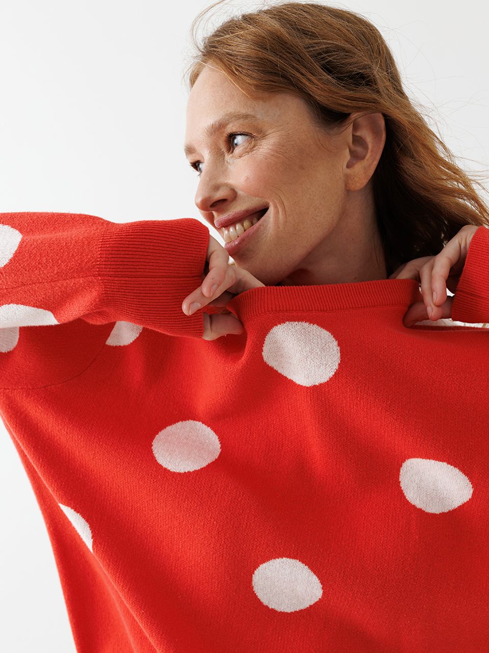 Вязаный джемпер красного цвета в горох от бренда Привет Мишка - это стильное и комфортное решение для тех, кто ценит индивидуальность. Модель выполнена из мягкого хлопка с гладкой фактурой, что обеспечивает приятные тактильные ощущения.