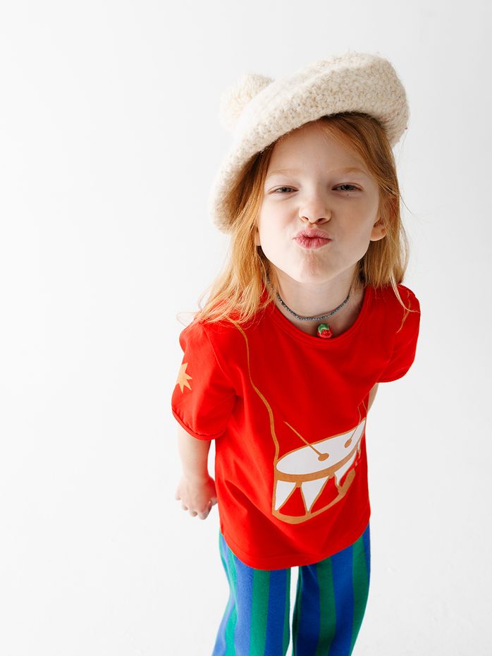 Красная футболка с барабаном приятная к телу, не просвечивает, плотная, отлично тянется и при этом сохраняет свою форму - вещь будет оставаться в своем первоначальном виде даже при частом ношении.