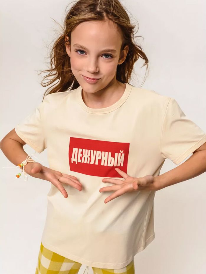 Детская винтажная хлопковая футболка с надписью "Дежурный" подходит и для мальчиков, и для девочек - модель унисекс.