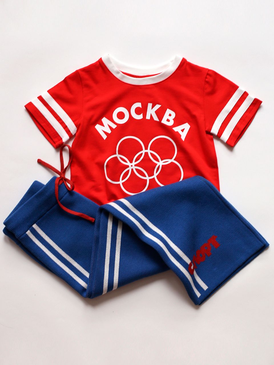 Красная детская футболка с надписью Москва-80 прямого кроя с лампасами на рукавах, в ретро-стиле подходит и для мальчиков и для девочек - модель унисекс.
