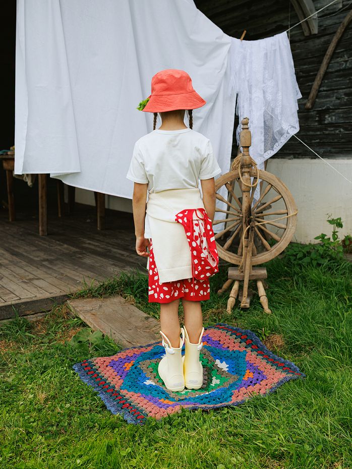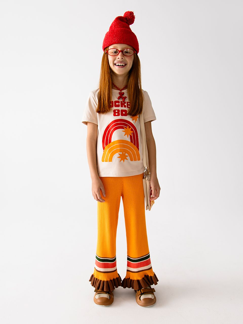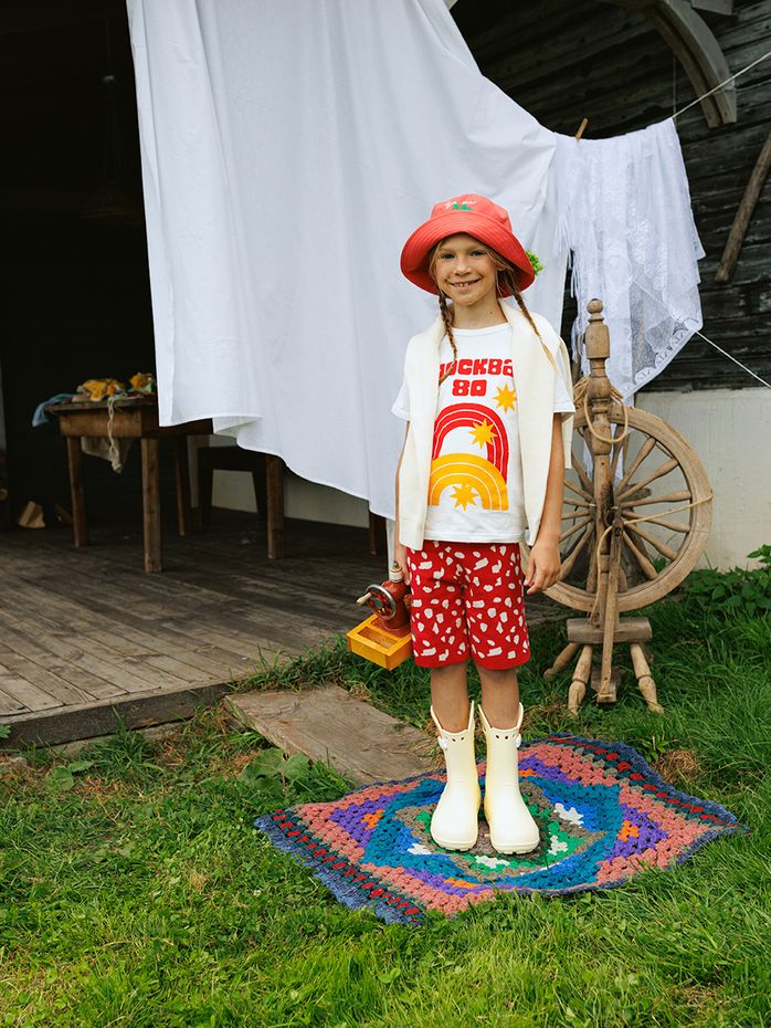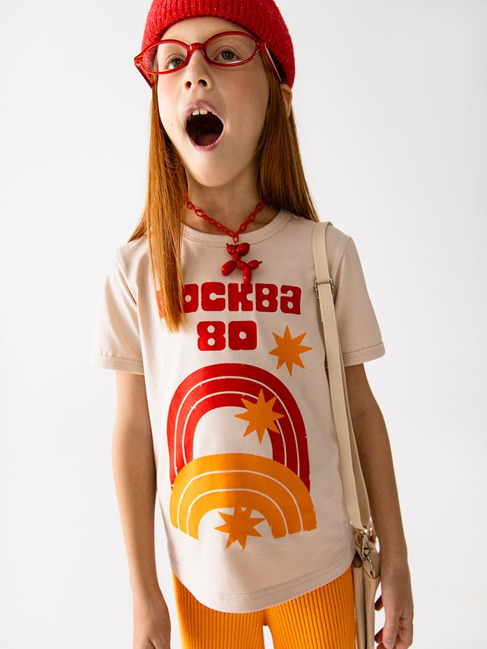 Ретро-принт, цвет винтажно-молочный. Выполненный в винтажном стиле рисунок в виде радуги и звезд смотрится особенно выигрышно благодаря приятному глазу цвету «ретро молочный».
