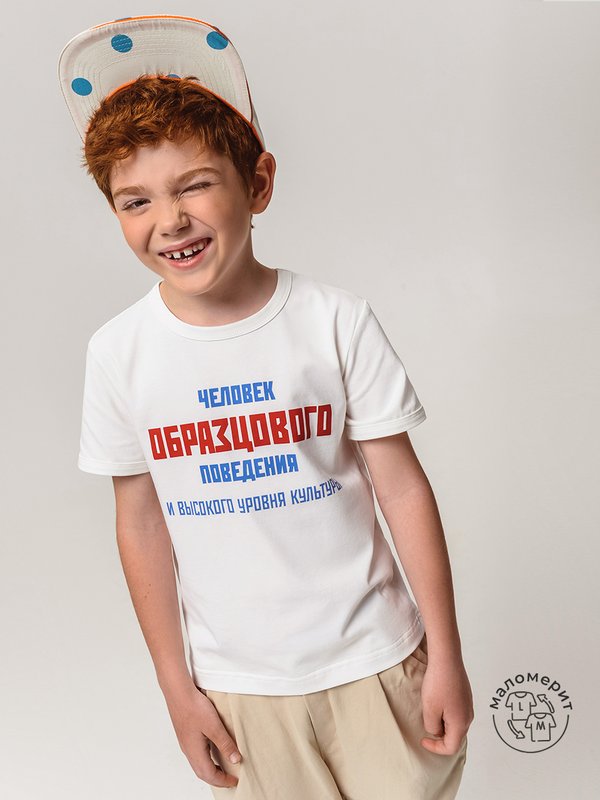 Детская винтажная хлопковая футболка белого цвета с надписью "Образцовый человек" подходит и для мальчиков, и для девочек - модель унисекс. Футболочка с текстом выполнена из высококачественного мягкого трикотажного полотна (хлопок).