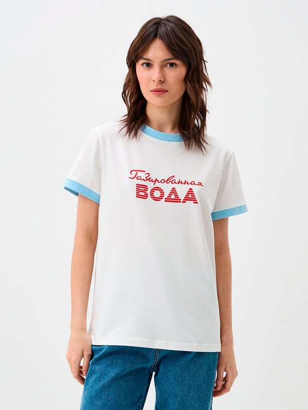 Женская белая хлопковая футболка прямого кроя с ретро-надписью "Газированная вода". Футболка с ностальгическим настроением отлично подойдет для повседневных образов с джинсами, шортами, а также под пиджак.