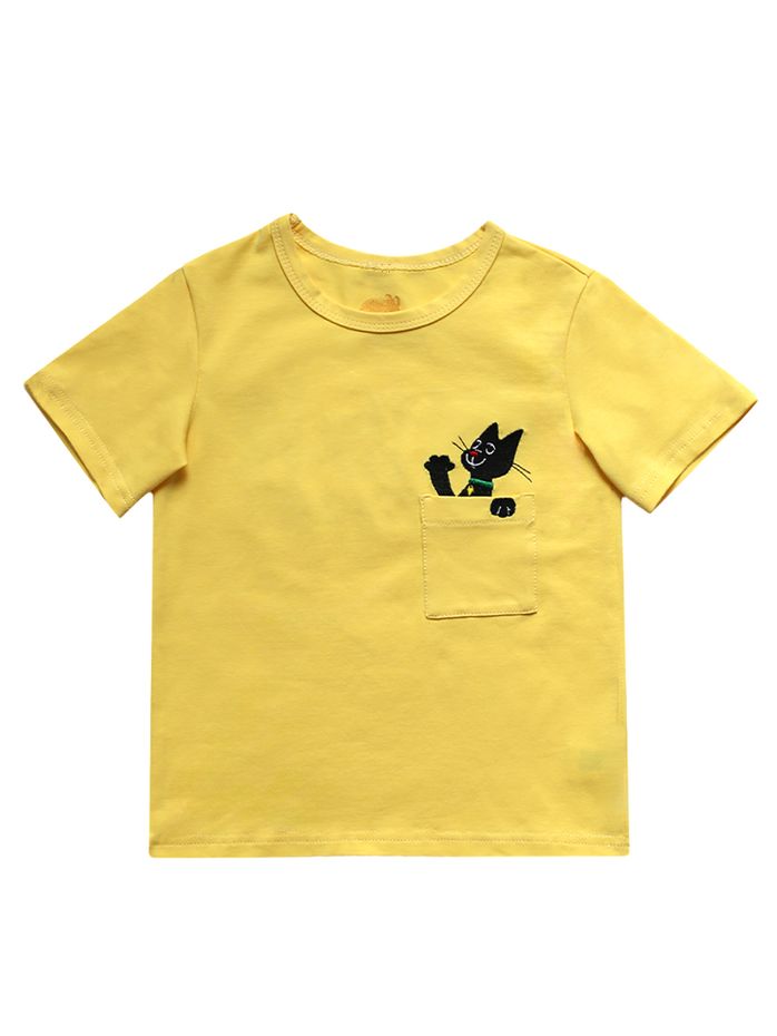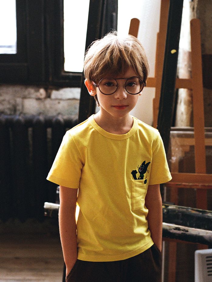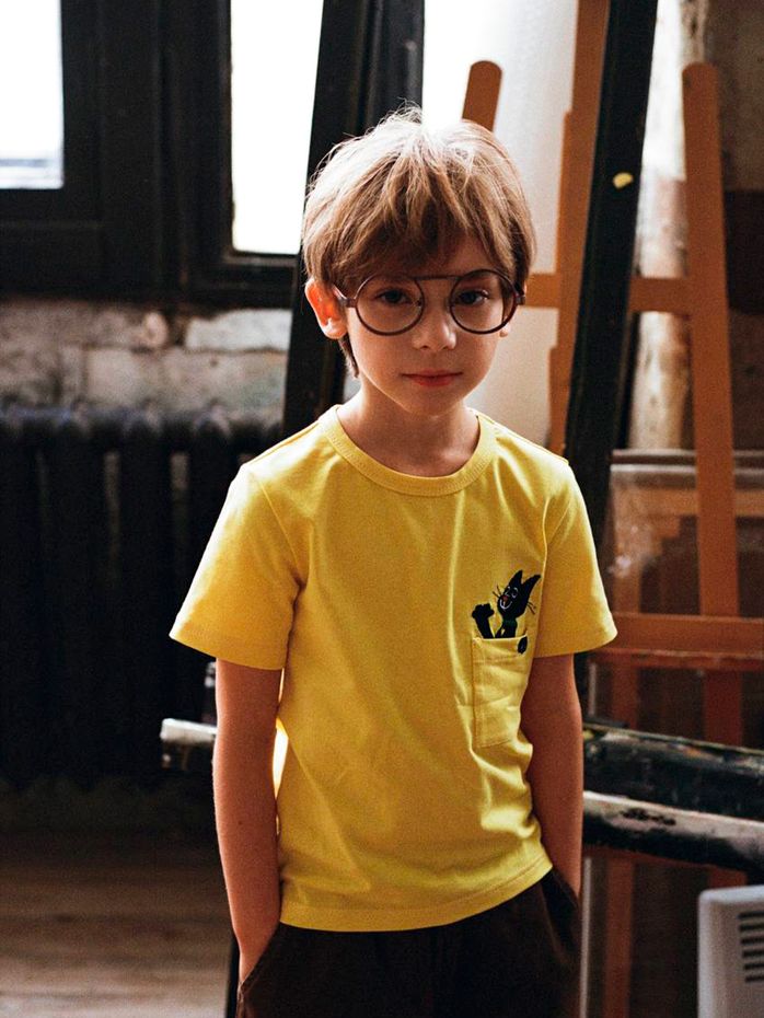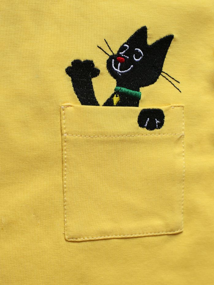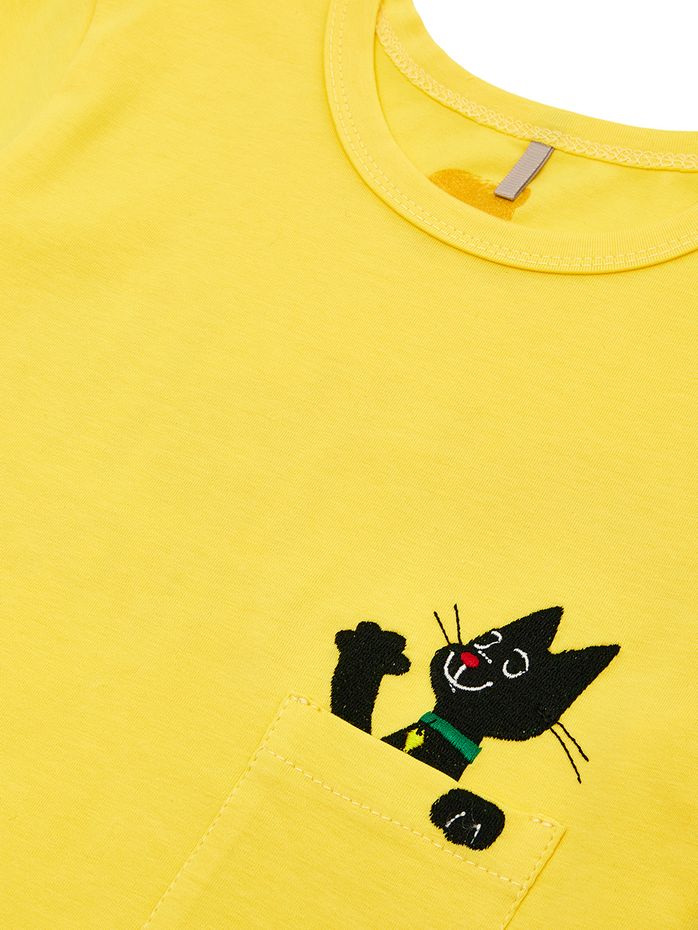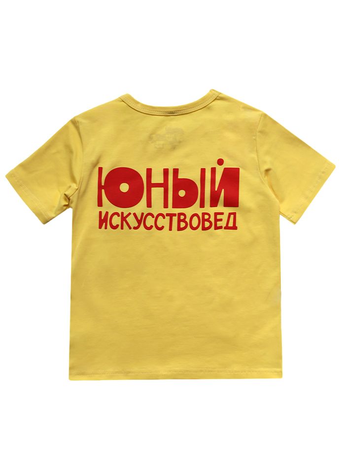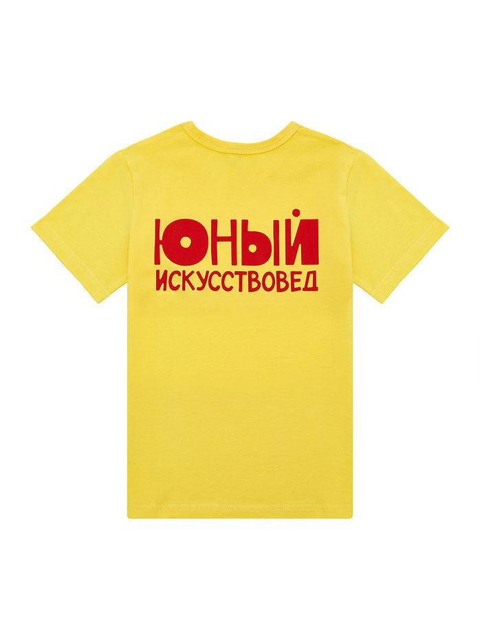 Футболка желтая с накладным карманом на груди, с забавной вышивкой кота и надписью "Юный искусствовед" на спине.