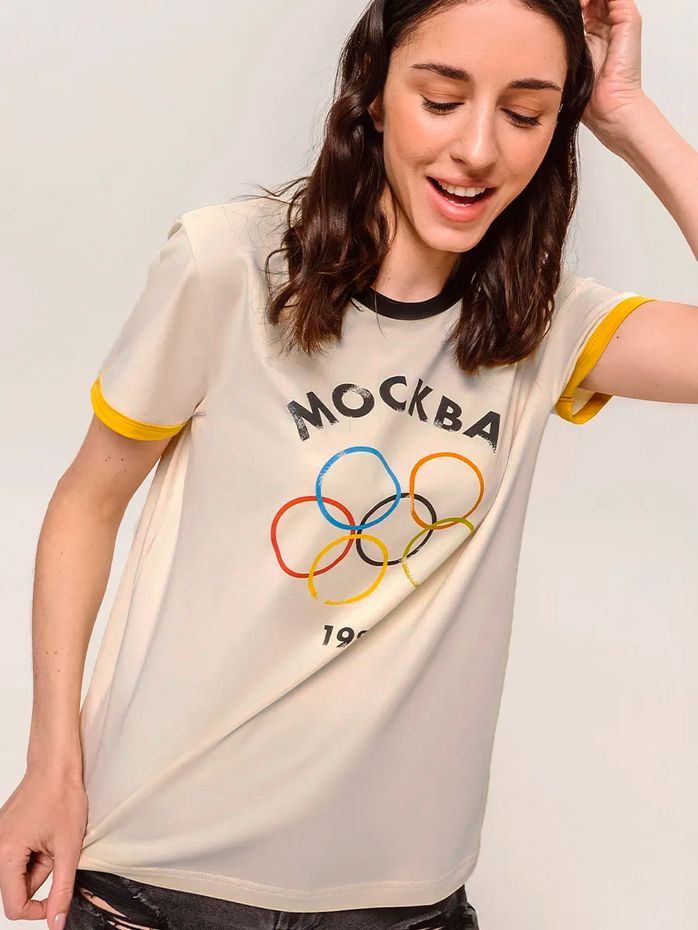 Женская хлопковая футболка прямого кроя с ретро-надписью Москва-80. Футболка с ностальгическим настроением отлично подойдет для повседневных образов с джинсами, шортами, а также под пиджак.