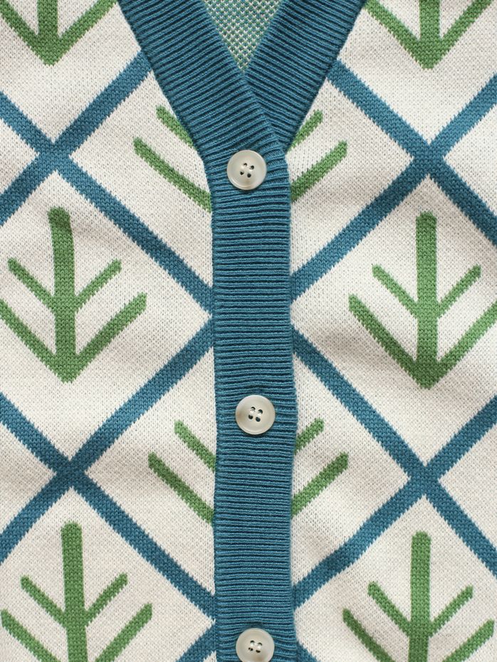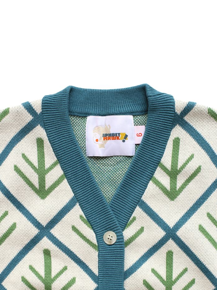 Вязаный кардиган с принтом Елочка подойдет мальчикам и девочкам. Выполнен из 100% хлопка с ностальгическим орнаментом в жаккардовой технике. Для посадки оверсайз выбирайте на размер больше.