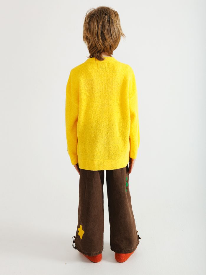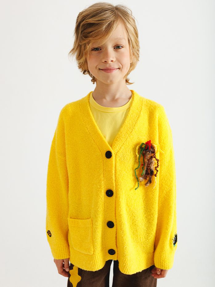 Плюшевый кардиган насыщенного желтого цвета с забавными нашивками на рукавах и акцентными пуговицами имеет V-образный вырез. Кардиган изготовлен из мягкого полотна, состоящим из шерсти и акрила.