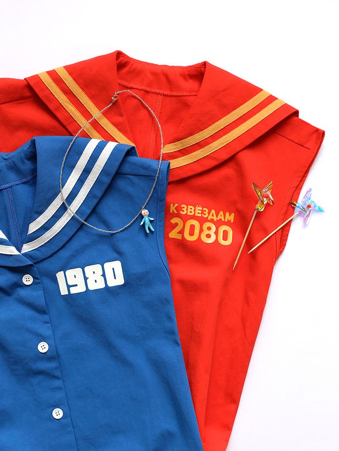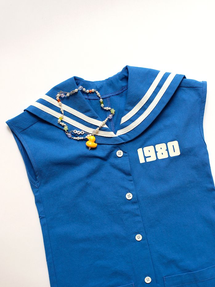 Комбинезон хлопковый для детей прямого кроя в ретро-стиле с надписью «Молоко» на отложенном воротнике на спине.