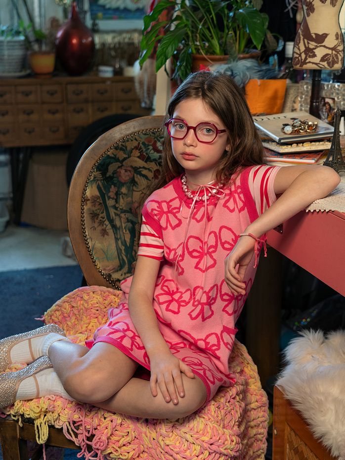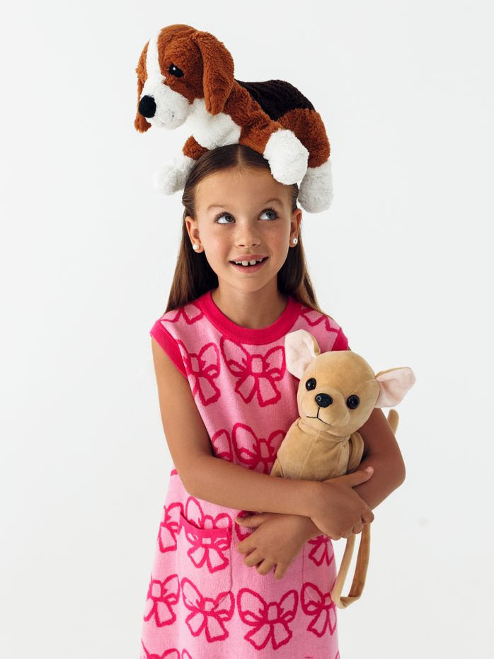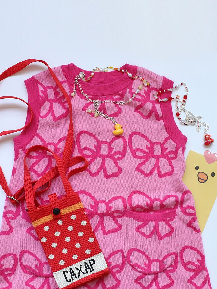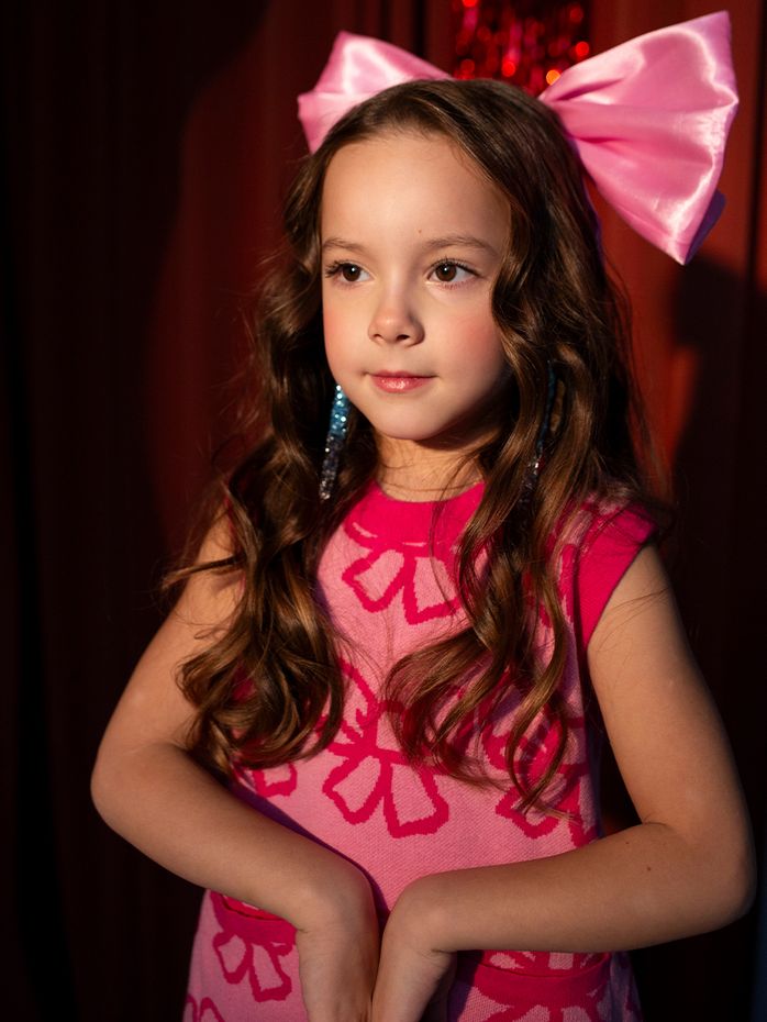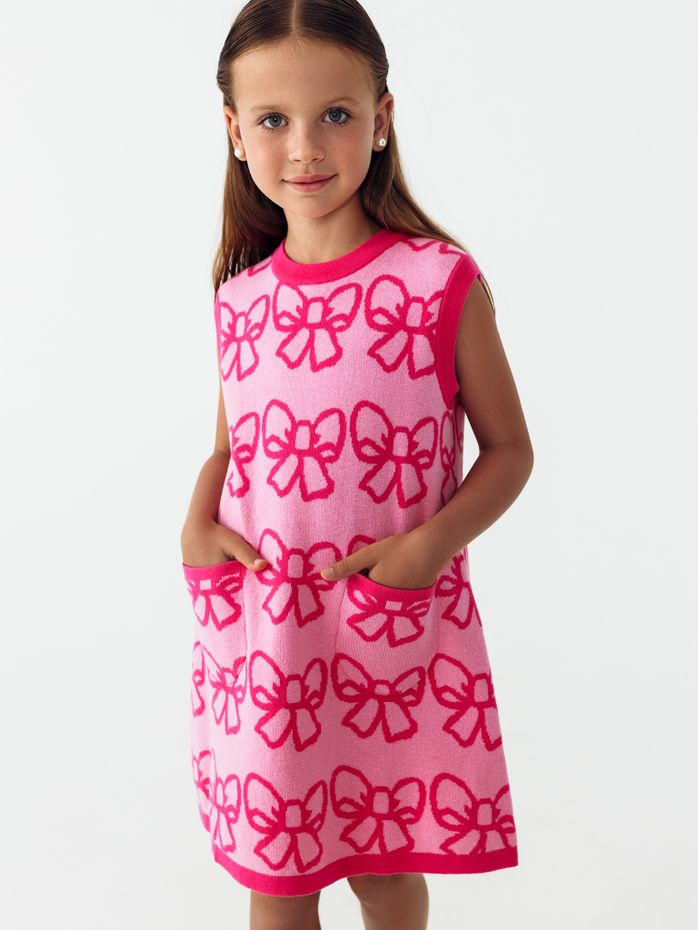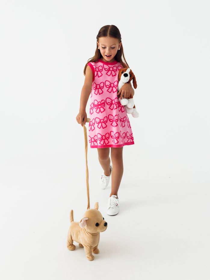 Наш ретро-хит в стиле Барби! Вязаное розовое мини-платье А-силуэта из 100% хлопка с жаккардовыми бантиками понравится вашей малышке. Подходит для нежаркого лета, а также можно носить круглый год как сарафан, поверх лонгслива, водолазки или рубашки без воротника.