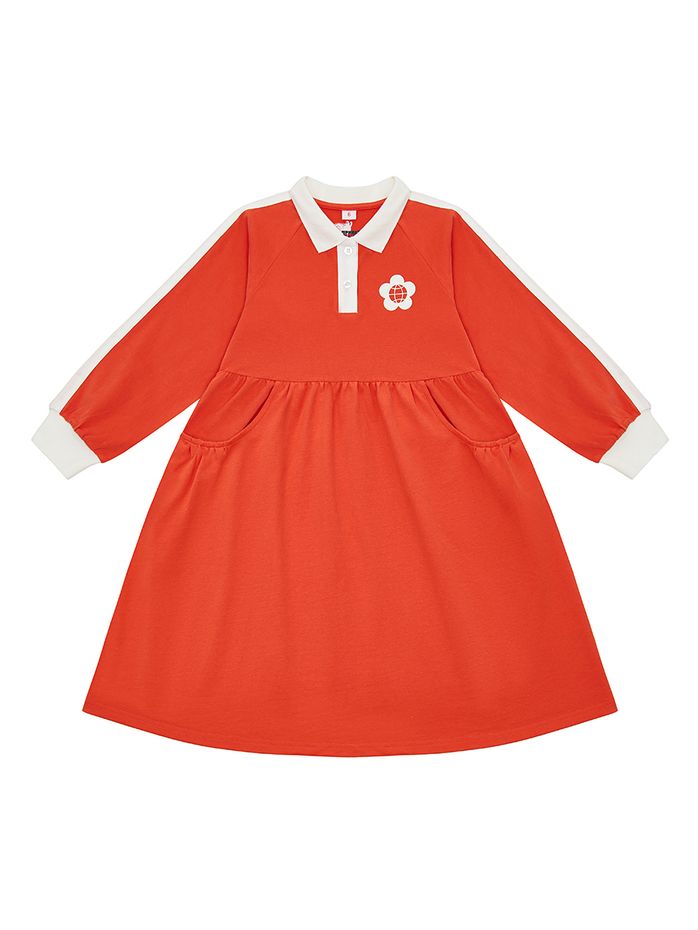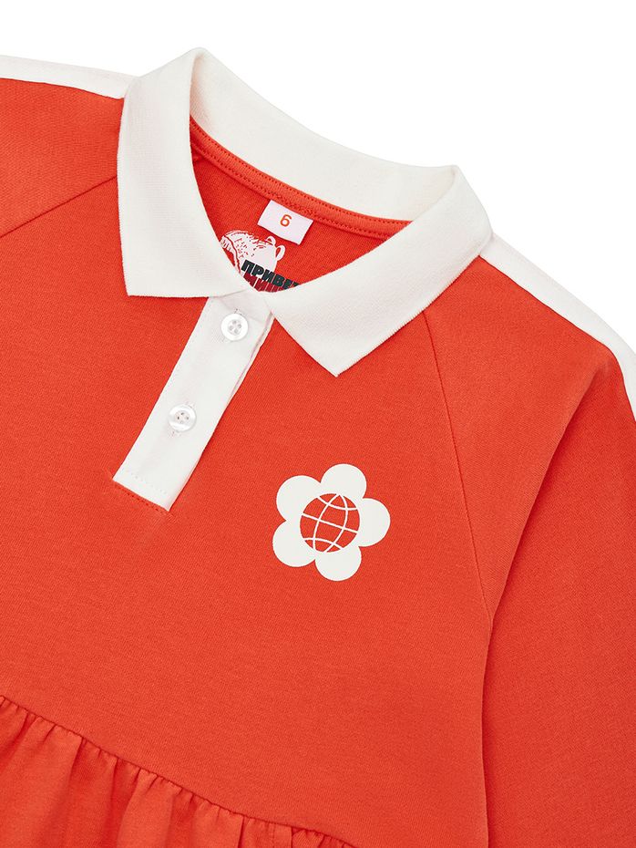 Платье-поло с отложенным, контрастным воротником белого цвета, плюс по рукаву проходит лампас. Воротник застегивается на две пуговицы спереди, прорезные карманы добавляют практичности. На груди изображена эмблема в виде глобуса и цветка, символизирующая мир во всем мире.