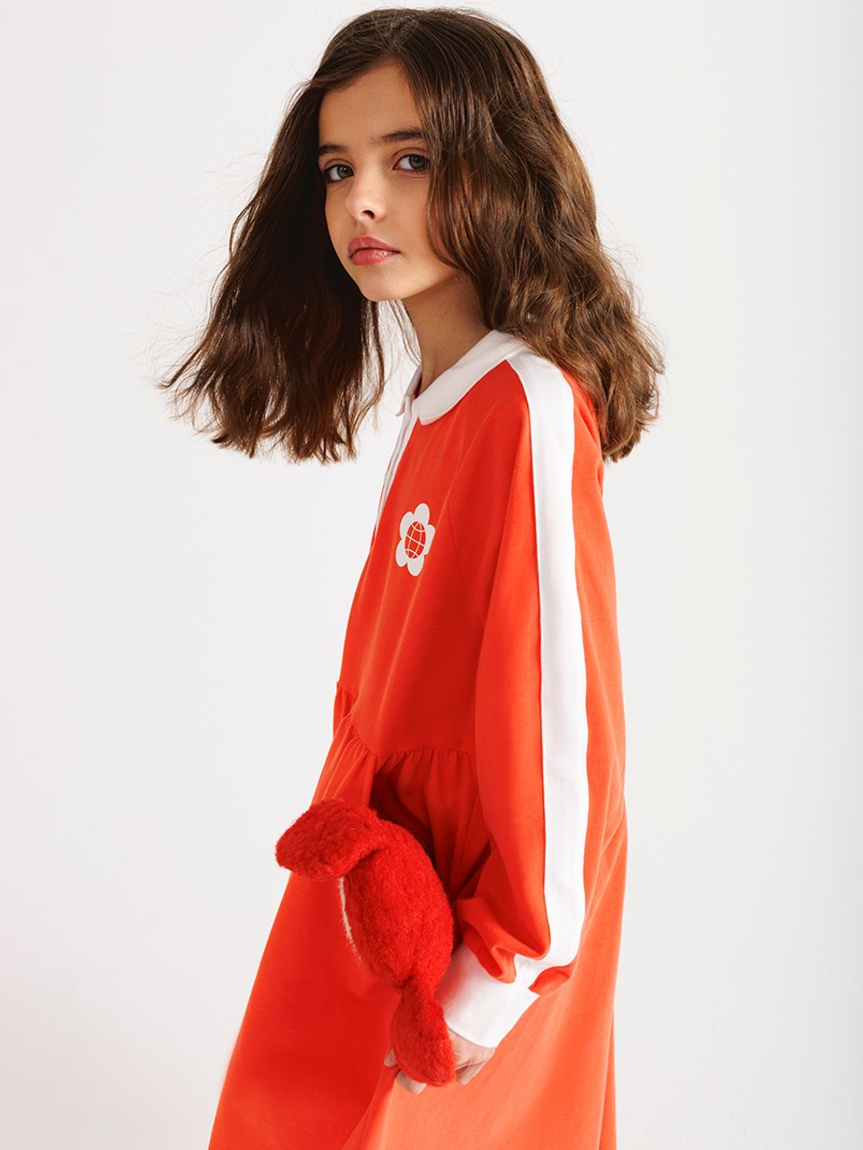 Уютное платье-миди кораллового цвета «Спорт и Мода» от "Привет Мишки" вдохновлено одноименным журналом, выпускавшимся в советское время.