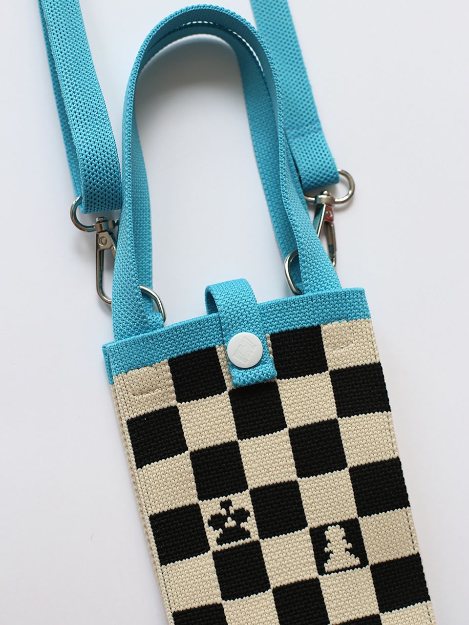 Наша маленькая сумочка для телефона и мелочей "Шахматы" в игривом настроении, вывязана из плотного полиэстера в жаккардовой технике, дополнена принтом, устойчива к истиранию и деформации. Длина ручки регулируется, максимальная 120 см.