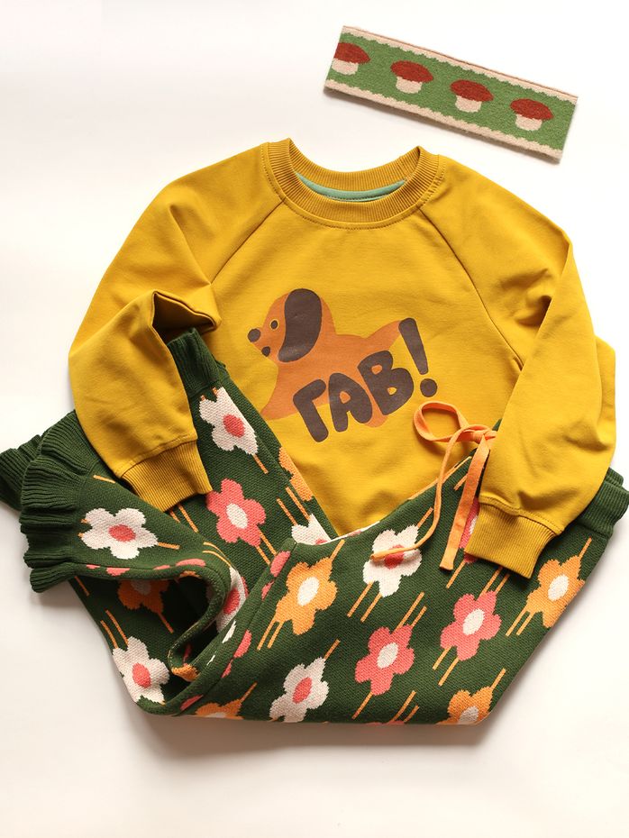Милый детский свитшот с рисунком Собачка "Гав-гав" горчичного ретро цвета. Уникальный дизайн, высокое качество пошива, хлопок сорта пенье - не пилингуется, не закатывается, при соблюдении правил ухода не садится и не теряет яркости, сделано в России на фабрике с достойными условиями труда и прекрасной атмосферой.