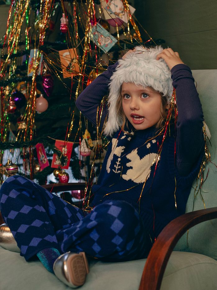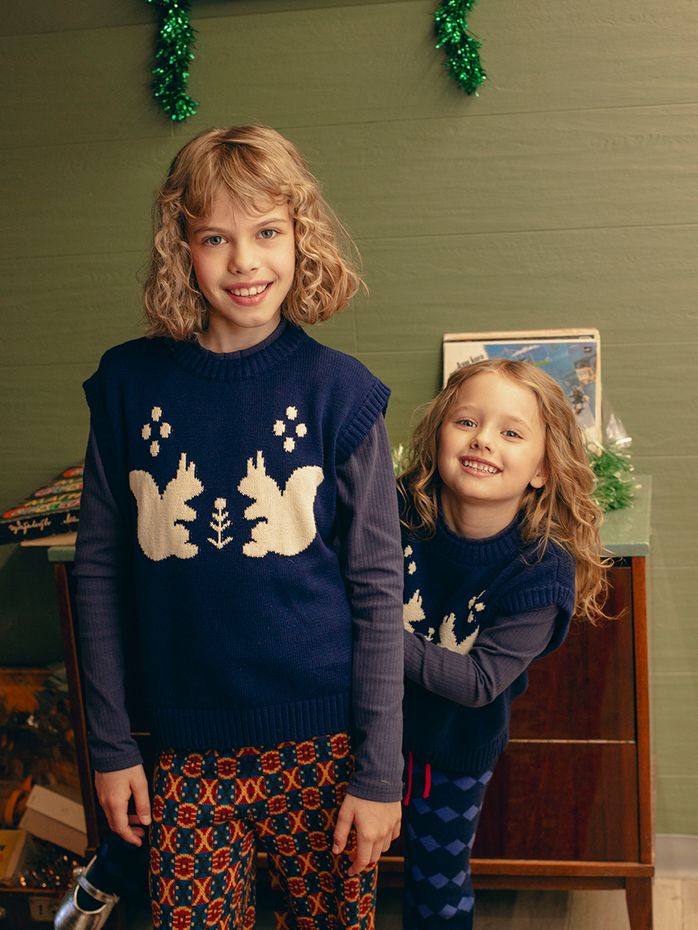 Детский трикотажный жилет для девочек и мальчиков с орнаментом "Белочки" а также с ностальгическим настроением и ароматом любимых конфет под новогодней елкой.