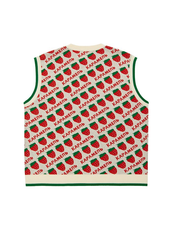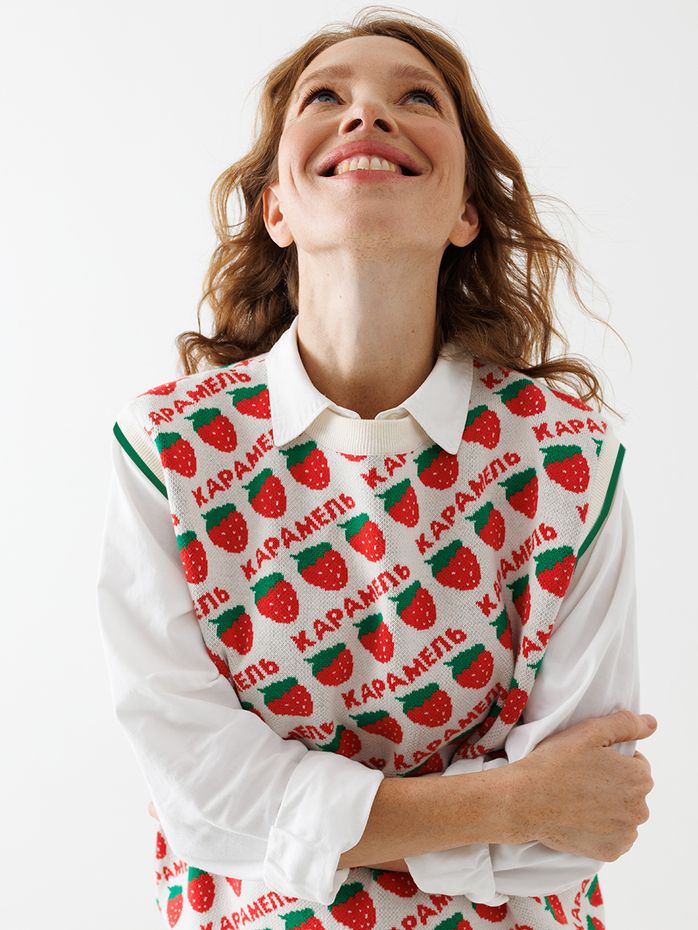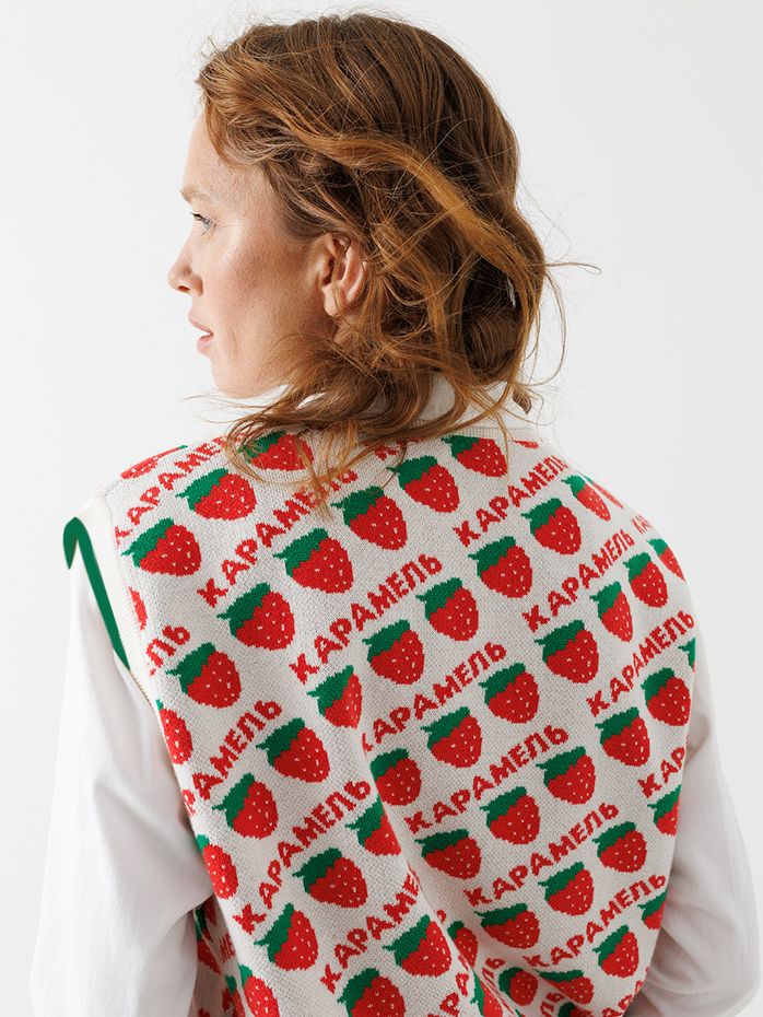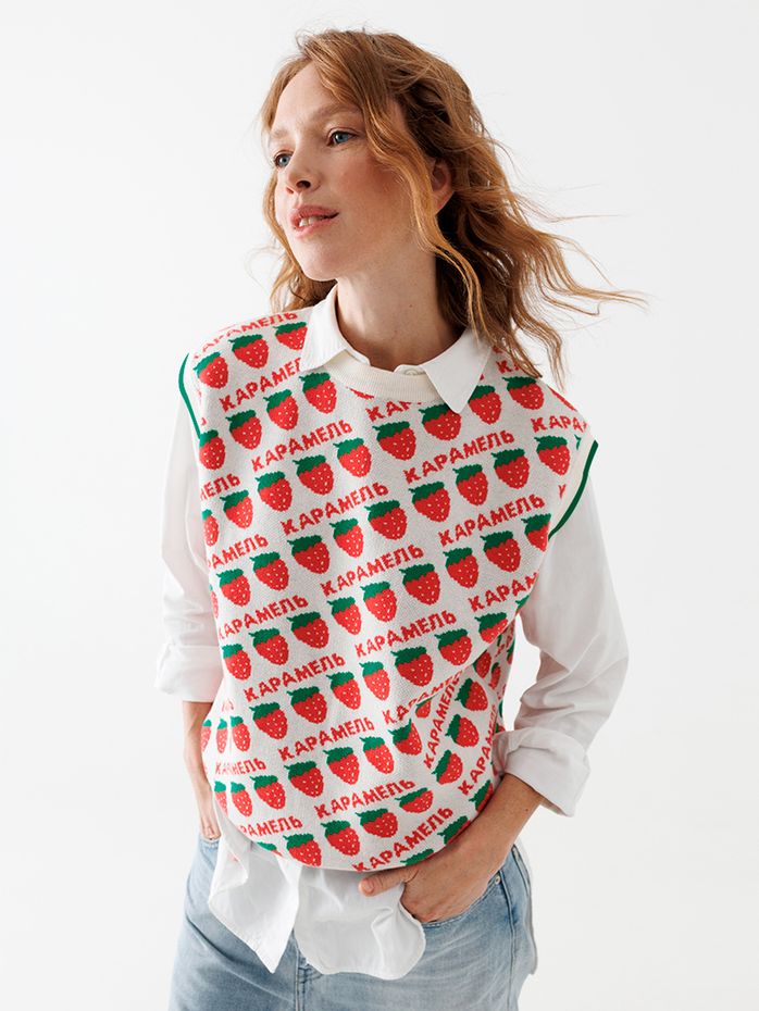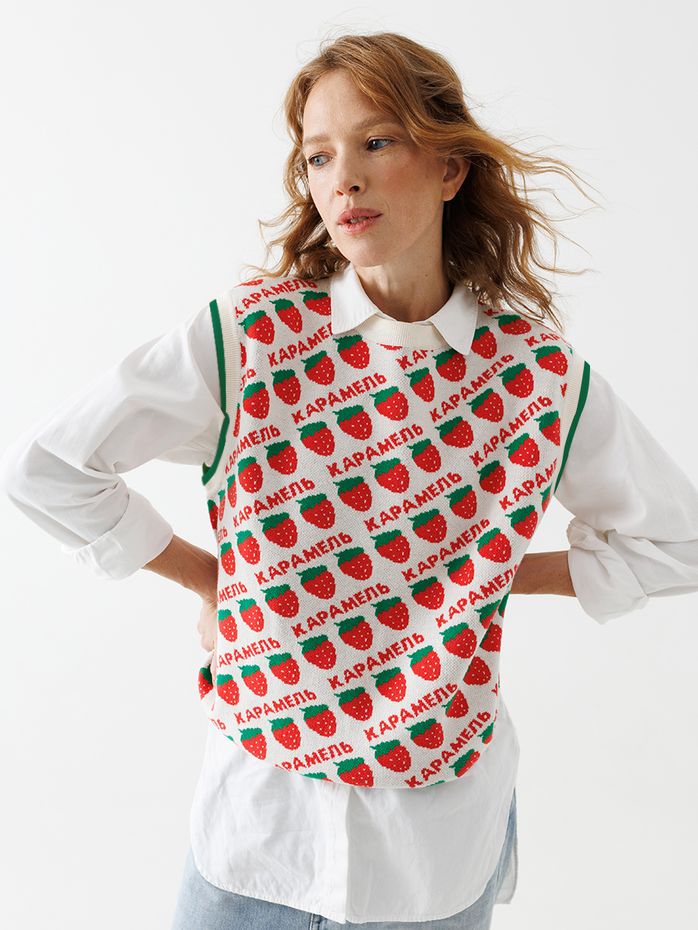 Жилет вязаный со свободной посадкой с паттерном Клубника может стать идеальным выбором как для повседневной носки, так и для особых случаев.